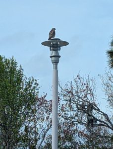 After a quick trip to the gift shop (where I picked up a greenshank print—love the hint of a smile and the view of St. Augustine in the background—and a roseate spoonbill postcard for my mum) I headed back to the car and spotted a red-shouldered hawk on a nearby lamppost 😍